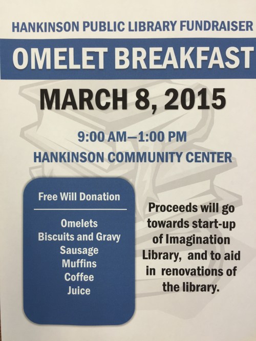 Please join the Friends of the Library for their second annual omelet breakfast. Sunday, March 8th, from 9 am to 1 pm at the Hankinson Community Center.