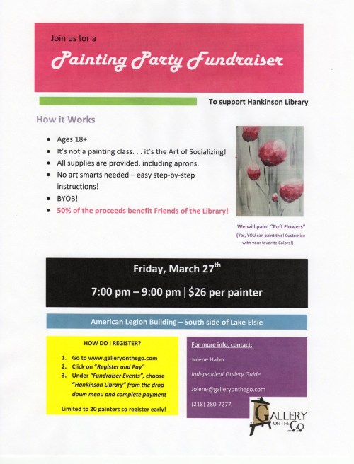 The Friends of the Hankinson Library would like to invite you to a night of fun, friends, and painting. Proceeds will go towards a great program, Imagination Library!